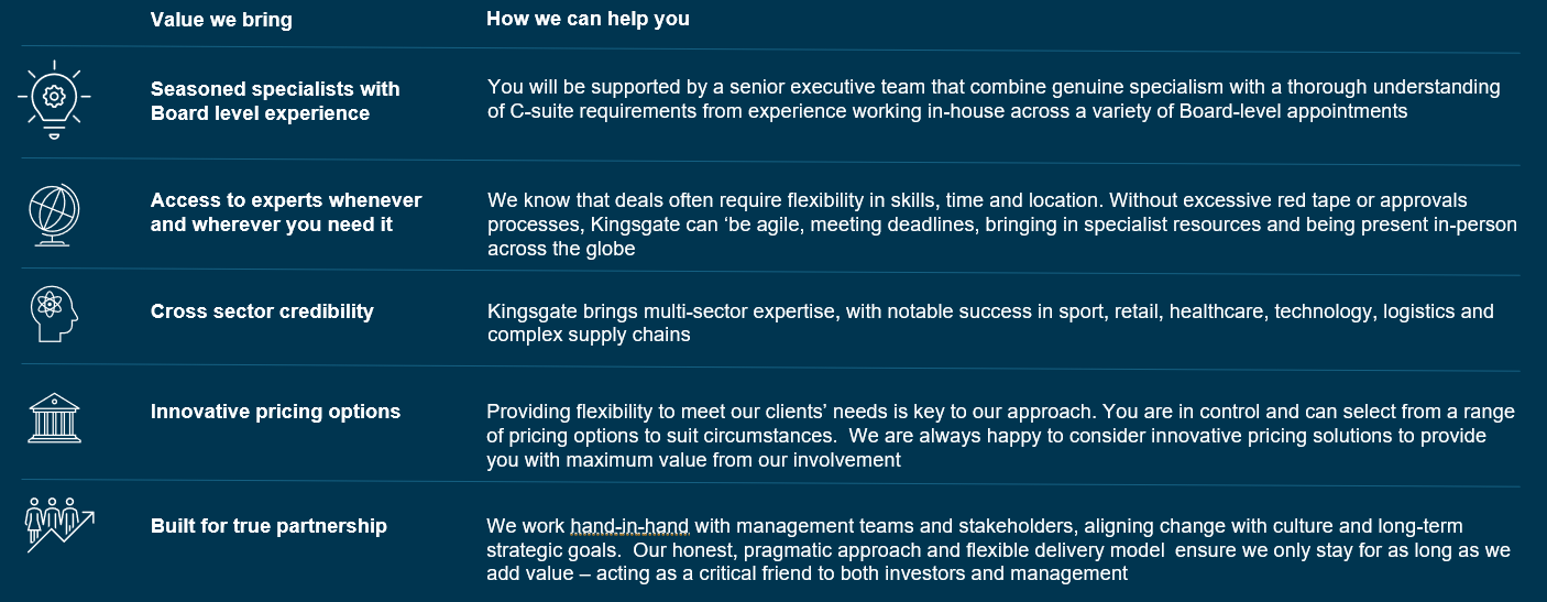 Kingsgate is a specialist management consultancy that applies dep knowledge and experience in Transformation and Turnaround in challenging situations.